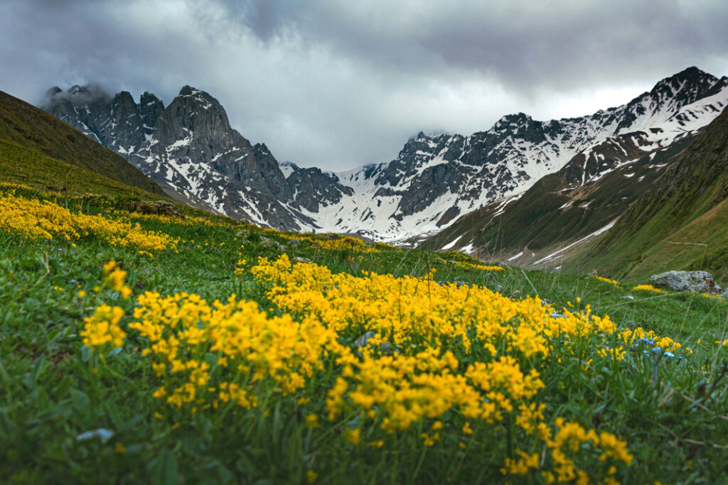 Ein Geländefahrzeug bringt euch nach Ushguli – das höchstgelegene besiedelte Dorf in Europa. Es liegt auf ca. 2.200 Metern Höhe und ist ein UNESCO Welterbe. Hier stehen die bunten Wiesen und Felder im Kontrast zu den schneebedeckten Bergen und bieten eine einzigartige Kulisse. Es geht zum höchsten Punkt – Shkhara – wo ihr für eine Erkundungstour so nah wie möglich an den Gletscher gebracht werdet. Wandere durch die Umgebung des Shkhara Gletschers und bewundere die Landschaft, den Anblick des Kaukasus, den Inguri Fluss, historische Türme und wunderschöne Pflanzen und Blumen.