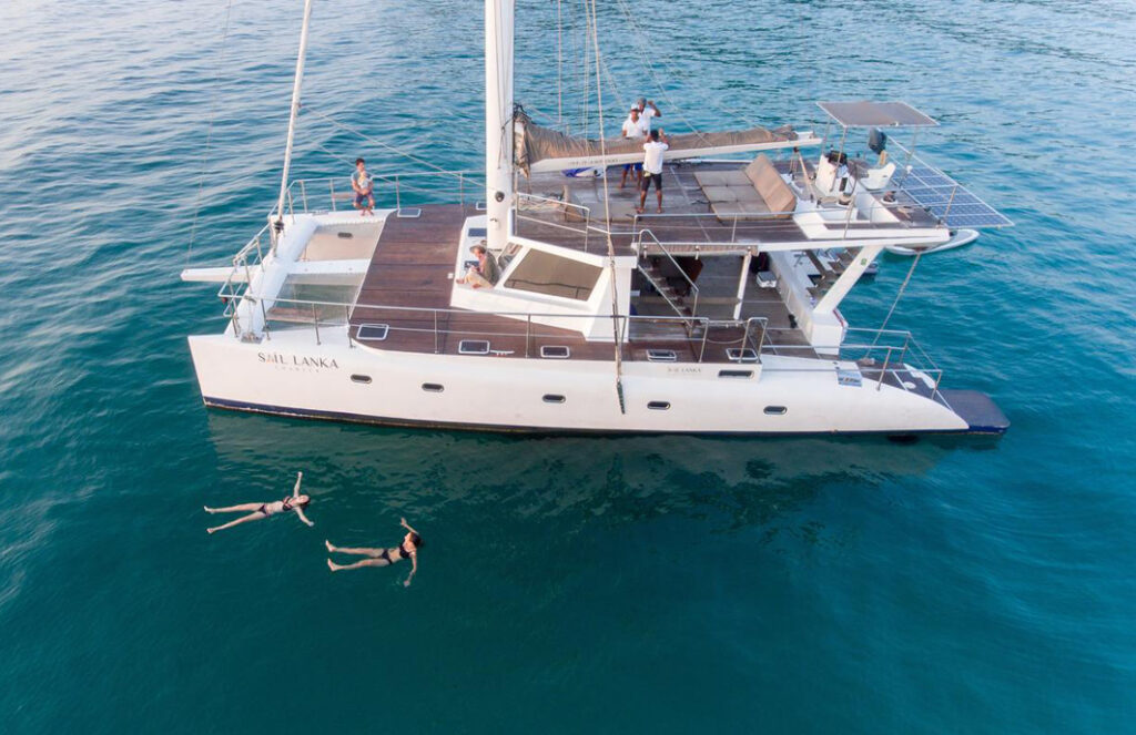 Der Tag beginnt mit einem echten Highlight: Der Katamaran steuert die kleine Bucht von Hiriketiya an. Ein verstecktes Paradies für alle, die das Meer lieben, denn hier warten Wellen, üppige Palmen und eine entspannte Atmosphäre auf dich und machen diesen Ort zum perfekten Spot für eine morgendliche Schwimmrunde oder eine spontane Surfsession. Danach geht es weiter entlang der Küste, immer auf Kurs Richtung Talalla Beach. Du und deine Mitreisenden segelt durch türkisblaues Wasser, das bei klarer Sicht manchmal von Delfinen oder sogar Meeresschildkröten durchzogen wird. Die Südküste zeigt sich wieder einmal von ihrer schönsten Seite. So fühlt sich echtes Segeln an den südlichen Stränden von Sri Lanka an. Am späten Nachmittag fällt der Anker. Je nach Wetterlage vor dem goldenen Strand von Talalla oder weiter westlich bei Dondra. Egal, wo ihr landet, ein tropischer Sonnenuntergang und ein entspanntes Abendessen an Deck warten auf dich.