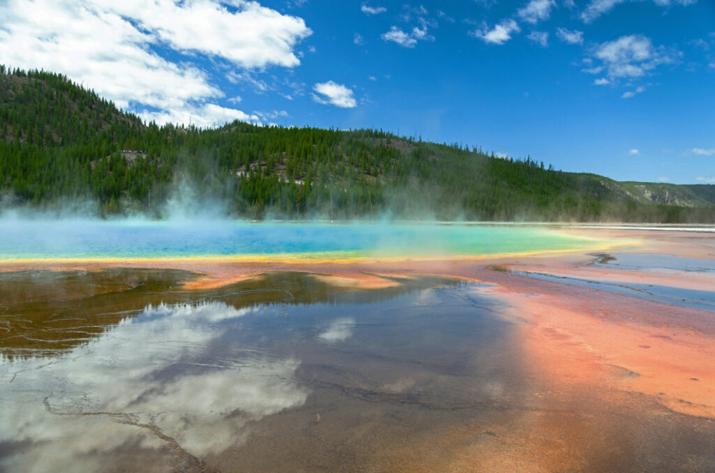 Ein weiteres Highlight ist die Grand Prismatic Spring, die größte heiße Quelle der USA. Ihre leuchtenden Farben von tiefem Blau bis hin zu leuchtendem Orange entstehen durch mikroskopisch kleine Organismen und Mineralien im Wasser und wirken fast surreal.