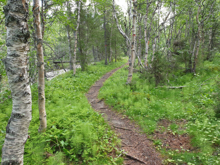 Die Tour auf dem insgesamt 140 km langen Padjelantaleden beginnt in einem typisch nordschwedischen Urwald. Auf dem Weg liegen sumpfige Gebiete, die aber allesamt auf Holz-Bohlenwegen trockenen Fußes überquert werden können.