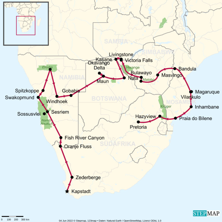 Distanz: Fahrt von Praia do Bilene nach Hazyview (ca. 410 km, ca. 10 Stunden Fahrzeit)