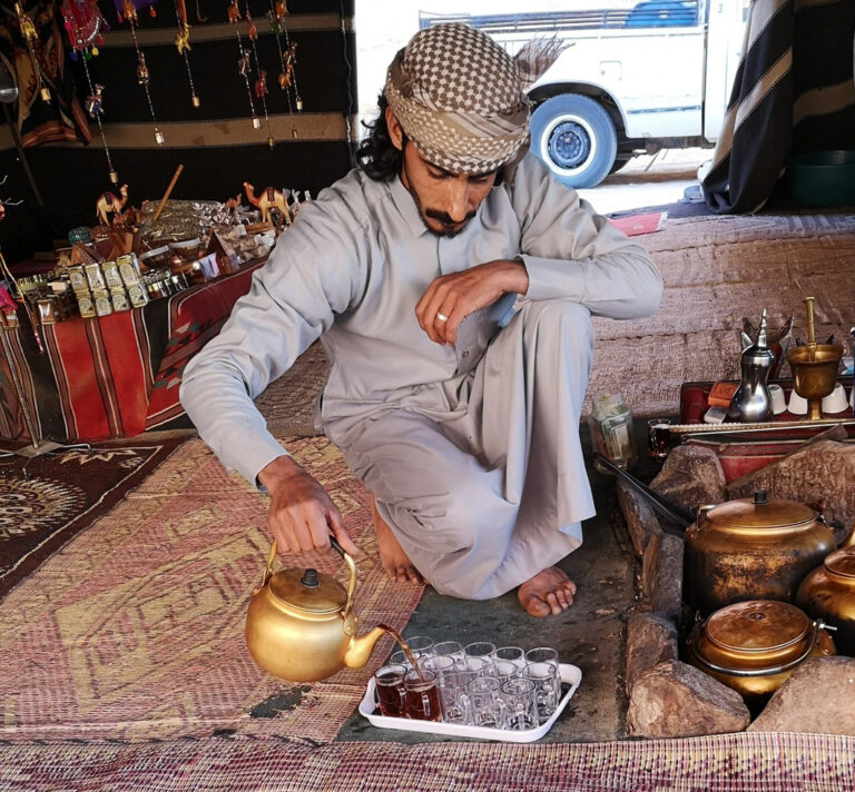 Heute fährst du mit deiner Gruppe in einem Geländewagen tief in die Wüste und genießt auf dieser unvergesslichen Fahrt die erstaunliche natürliche Schönheit und die einzigartige Landschaft. Unterwegs fährst du auf roten Sanddünen, siehst atemberaubende Felsformationen und besuchst antike Stätten, um Felskunst und Inschriften zu betrachten – die Kamera wird vor lauter traumhafter Foto-Spots gar nicht mehr aufhören können wunderbare Momente einzufangen. Nach eurer Ankunft im Wüstencamp werdet ihr zu einer traditionellen Mahlzeit eingeladen, während du mehr über die alte Beduinenkultur und -geschichte erfährst. Wenn die Sonne untergangen ist, erwartet dich ein atemberaubender Blick in den nächtlichen Sternenhimmel. Kannst du alle Sterne zählen, die du siehst?