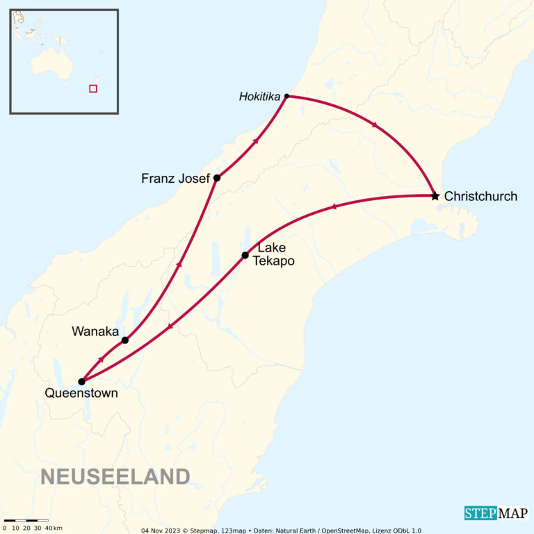 Willkommen auf der Südinsel Neuseelands in Christchurch! Hier beginnt deine Rucksackreise mit einem Willkommenstreffen um 8 Uhr morgens, bei dem du deinen Reiseleiter und deine Mitreisenden kennenlernst. Anschließend begebt ihr euch gemeinsam auf eine geführte Stadttour durch Christchurch. 2011 erlitt die Innenstadt erhebliche Schäden durch ein heftiges Erdbeben, aber ihr werdet beeindruckt sein, wie kreativ die Einheimischen mit der Situation umgegangen sind und die Stadt wieder aufgebaut haben. Ein berühmtes Beispiel ist die wiedererbaute „Papp-Kathedrale“, die zu einem der faszinierendsten architektonischen Meisterwerke der Stadt zählt. Ihr verlasst Christchurch und steuert Lake Tekapo an, der euch mit seinem azurblauen Wasser inmitten eines traumhaften Bergpanoramas verzaubern wird. Abgerundet wird diese magische Kulisse mit der romantischen Church of the Good Shepherd im Vordergrund. Diese einzigartige Kulisse ist besonders beliebt bei frisch Verheirateten. Also unbedingt ein unvergessliches Foto schießen und den Liebsten daheim senden. Und gerade, wenn du dachtest, es könnte nicht besser werden, wird dir der nächtliche Sternenhimmel über Lake Tekapo den Atem verschlagen. Als ausgewiesenes Dark Sky Reservat kannst du bei klarem Himmel wunderbar die unzähligen Sterne bewundern.