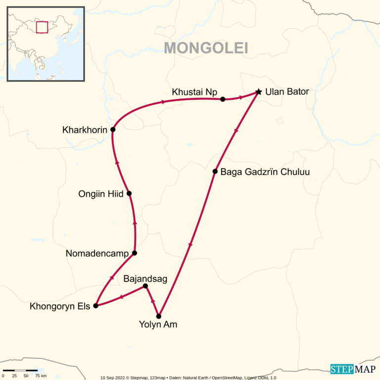 Hinweis: Abhängig von der Größe der Nomaden-Familie und deren Gers, können die Unterkünfte sehr einfach sein. Für den Fall, dass die Nomaden nicht genügend Platz für die Gruppe bereitstellen können, werden in der Nähe Zelte für die Nacht errichtet (Campingausrüstung wird bereitgestellt).